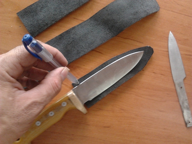 یکی از قطعات کوچیک رو که برای لایه وسط باید استفاده بشه تیغه کارد رو روش قرار میدیم و با خودکار دور تا دور تیغه رو به فاصله حدود یک میلیمتر خط میکشیم هرچه این فاصله کمتر باشه کارد بهتر و محکمتر سرجاش کیپ میشه
